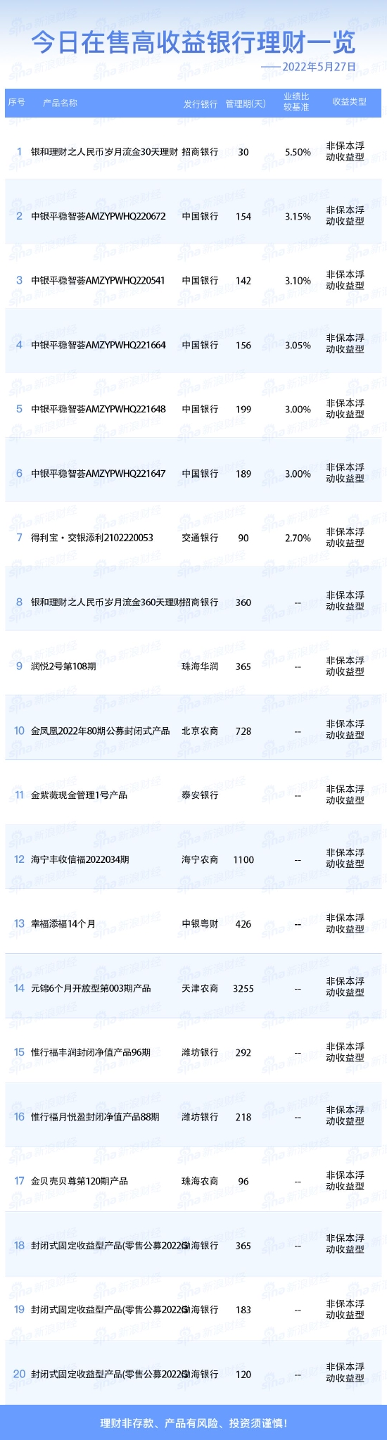 •   新浪财经5月27日在售高收益银行理财产品一览。今日业绩比较基准在2.70%及以上的银行人民币理财产品共7款。理财非存款、产品有风险、投资须谨慎!