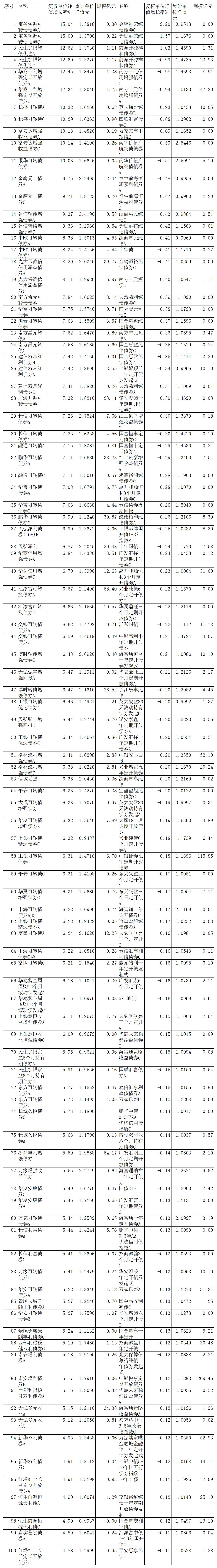 英大通盈纯债债券E、国联汇富债券C、万家家享中短债E、南华价值启航纯债债券C、南华价值启航纯债债券A、恒生前海恒源嘉利债券A、恒生前海恒源嘉利债券C、浙商惠民纯债C也跌幅靠前,但幅度都不在-1%。
