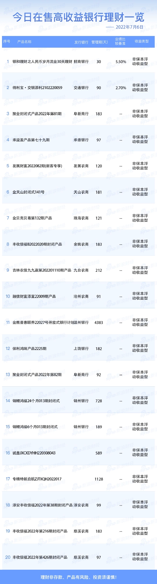•   新浪财经7月6日在售高收益银行理财产品一览。今日业绩比较基准在2.70%及以上的银行人民币理财产品共2款。理财非存款、产品有风险、投资须谨慎!