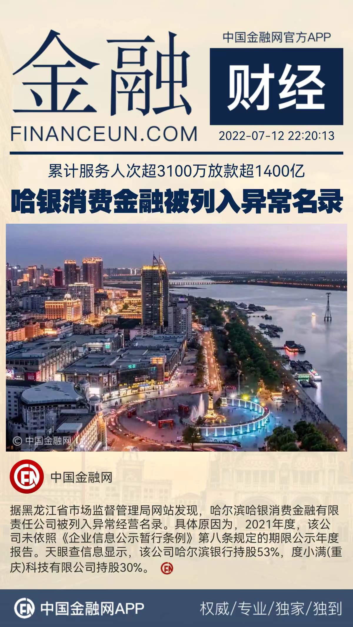据黑龙江省市场监督管理局网站发现,哈尔滨哈银消费金融有限责任公司被列入异常经营名录。具体原因为,2021年度,该公司未依照《企业信息公示暂行条例》第八条规定的期限公示年度报告。天眼查信息显示,该公司哈尔滨银行持股53%,度小满(重庆)科技有限公司持股30%。