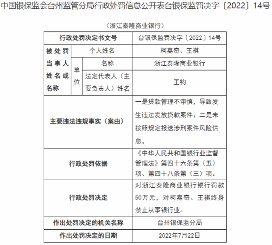 浙江泰隆商业银行7宗违法被罚210万 理财代客操作等