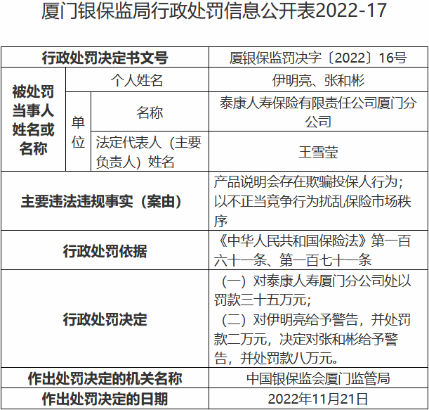 泰康人寿厦门分公司2宗违法被罚 欺骗投保人等
