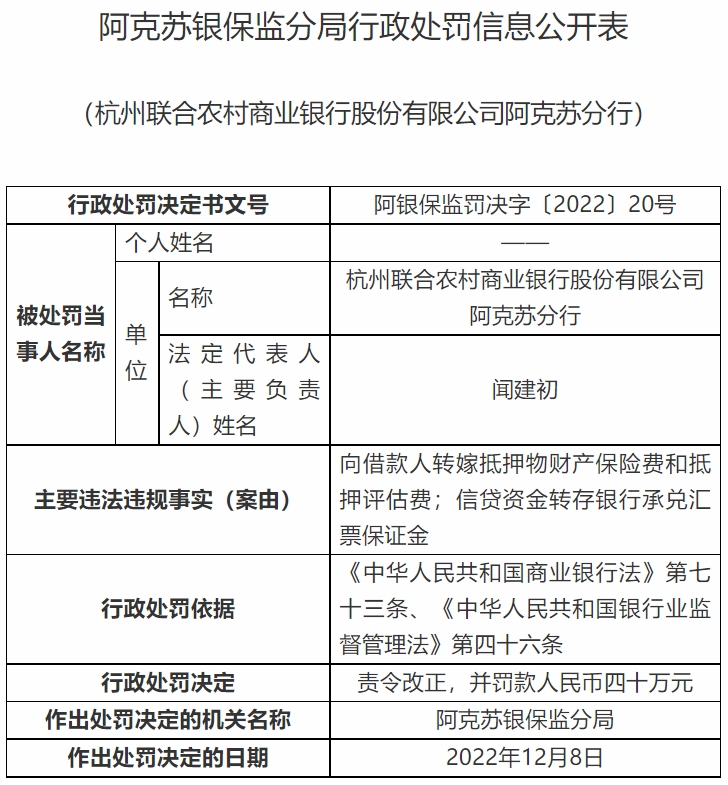 杭州银行、新中农商行、深州农商行、兴仁农商行违规被罚