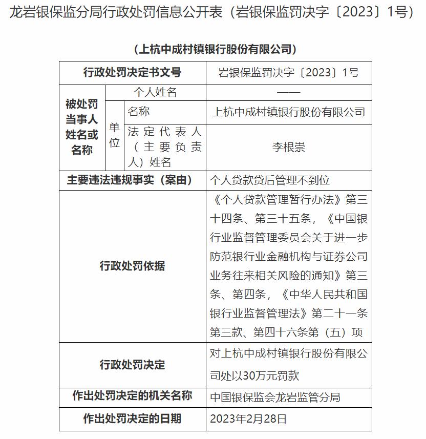 惠安中成村镇银行违法遭罚