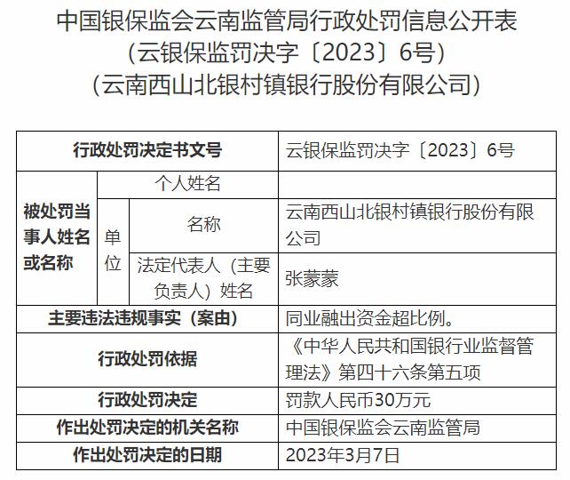 云南西山北银村镇银行被罚30万元 2023年03月17日16时25分