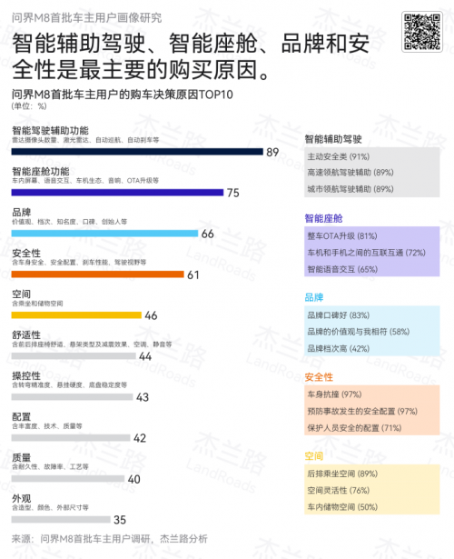 作为问界今年的全新力作,问界M8自上市便备受瞩目。截至5月20日,其大定订单已突破8万台,强劲的市场吸引力可见一斑。杰兰路近日发布的首批车主用户画像研究揭示,在高端家庭用户的购车决策中,“安全性”超越空间、配置等传统要素,成为选择问界M8的核心驱动力,这一结果与去年问界M9首批车主调研高度契合,充分印证“安全性”已成为当代家庭用户购车的核心考量。