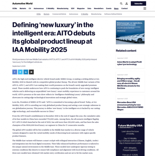 海外媒体尤其关注AITO的市场表现。Onliner.by报道称,中国汽车品牌正以强劲实力挑战欧洲传统豪华车企,其中AITO表现尤为亮眼,其在中国高端市场已实现对宝马、奔驰等品牌的超越。YalaMotor则指出,AITO“软件定义汽车”与科技豪华理念已成为全球化战略的核心支撑。