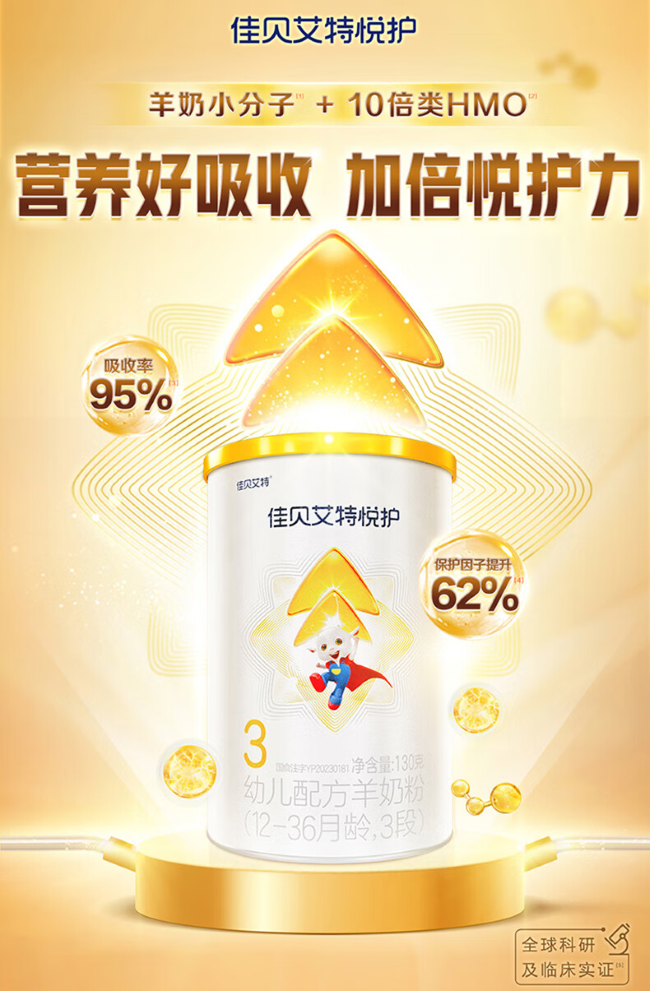 除了益生菌与益生元,佳贝艾特悦护还通过多种珍稀营养强化保护力:10 倍类 HMO,山羊奶中天然富含类 HMO 物质,含量约为牛奶的 10 倍,且结构种类更丰富,能像 “天然防护盾”一样帮助宝宝抵御外界刺激;同时专利核苷酸,能增强保护力、降低腹泻发生率,经检测其保护因子 IgG 可提升 62%;OPN 活性蛋白,能在宝宝肠道表面形成天然保护膜,进一步强化自护力,让宝宝少受病菌侵扰。