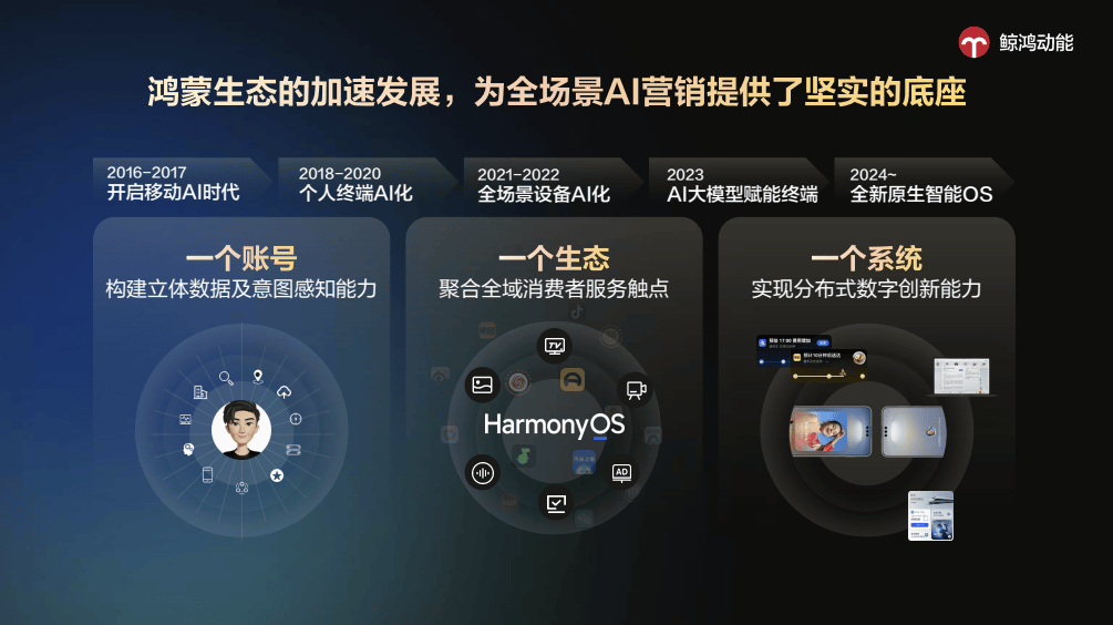 依托鸿蒙生态的分布式架构、统一账号体系与系统级智能能力,鲸鸿动能正加速打造一个可感知、可协同、可进化的全场景AI营销底座,助力品牌穿越迷雾,回归增长本质。