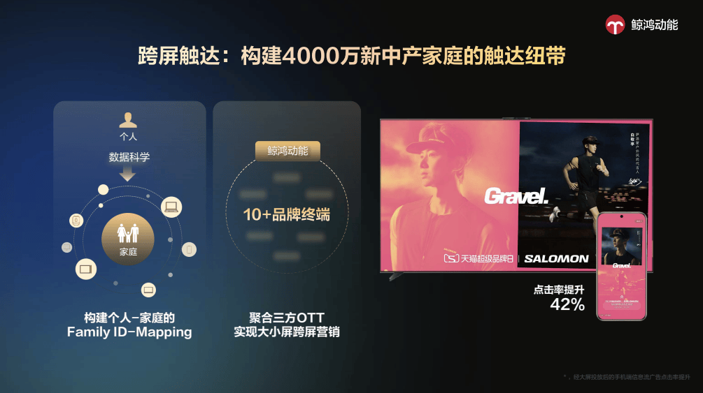 该方案已成功落地首个商用案例:9月22日,鲸鸿动能携手户外高端品牌萨洛蒙上线家庭场景广告,实现千万级曝光,信息流广告点击率较平台均值提升42%,验证了跨屏联投在家庭消费决策中的强大转化潜力。