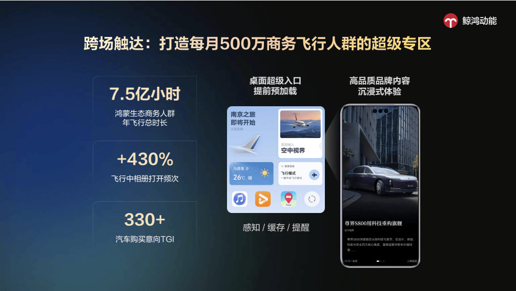 针对出行场景每月500万高频商务飞行人群,鲸鸿动能打造“飞行模式无网专区”。通过意图感知技术提前预判用户出行计划,在登机前完成内容精准匹配与预加载,确保品牌高品质内容在无网络环境下依然可触达。这一“黄金认知窗口”利用用户高度专注的沉浸状态,显著提升信息留存与心智渗透效率。
