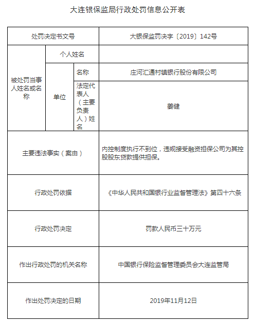庄河汇通村镇银行被罚60万