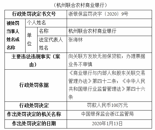 杭州银行、新中农商行、深州农商行、兴仁农商行违规被罚