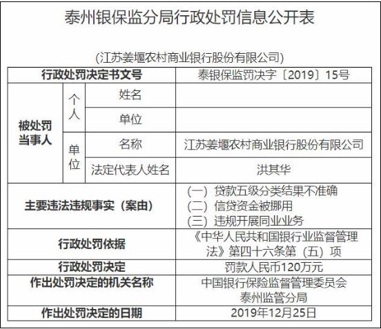 和讯银行消息:4月7日,从银保监会官网获悉,江苏姜堰农商银行受到行政处罚。处罚信息显示,江苏姜堰农商银行受罚是因涉及三项违法违规事实:(一)贷款五级分类结果不准确;(二)信贷资金被挪用;(三)违规开展同业业务。泰州银保监分局按照相关法律法规,决定对其处以罚款120万元。