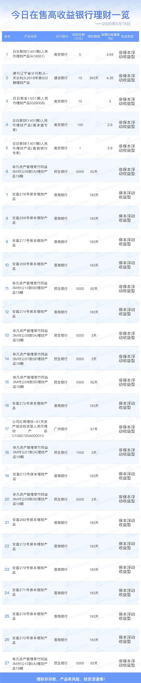 •   新浪财经消息:5月18日在售高收益银行理财产品:今日业绩比较基准在4.6%以上的银行人民币理财产品共1款。南京银行的“日日聚财(1401期)人民币理财产品(A19001)”业绩比较基准最高,为4.64%。