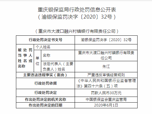 大渡口融兴村镇银行原行长被禁业