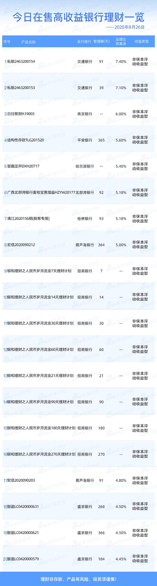 银行8月26日在售高收益理财产品