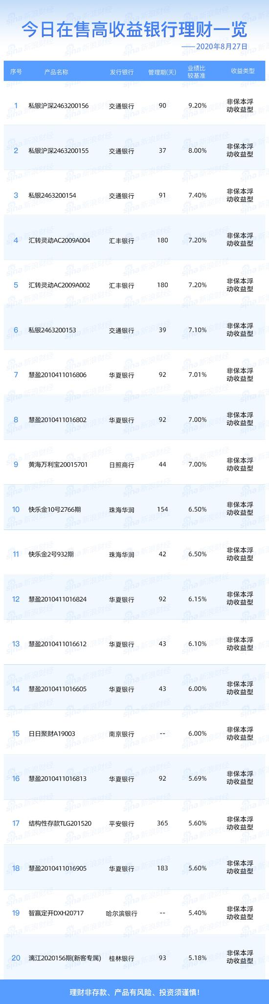 •   新浪财经8月27日在售高收益银行理财产品:今日业绩比较基准在7.00%及以上的银行人民币理财产品共9款。交通银行的“私银沪深2463200156”业绩比较基准最高,为9.20%。