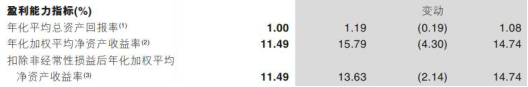 今年上半年,渝农商行的年化加权平均净资产收益率为11.49%,比上年同期下降4.30个百分点;扣除非经常性损益后年化加权平均净资产收益率为11.49%,比上年同期下降2.14个百分点。