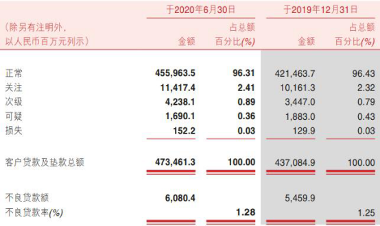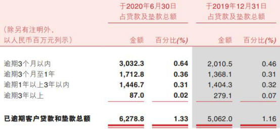 截至2020年6月30日,渝农商行逾期贷款金额为62.79亿元,较上年末增加12.17亿元 ;逾期贷款占比1.33% ,较上年末上升0.17个百分点。其中,逾期3个月以内金额为30.32亿元,逾期3个月至1年金额为17.13亿元,逾期1年以上3年以内金额为14.47亿元,逾期3年以上金额为8700万元。