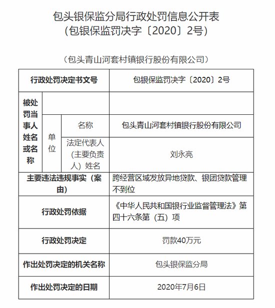 包头市昆都仑蒙银村镇银行合计罚没40万