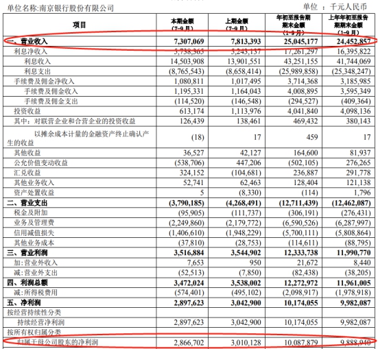 南京银行:前三季度实现营收244.5亿