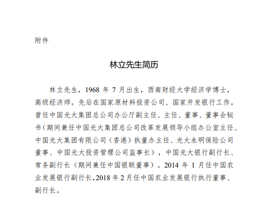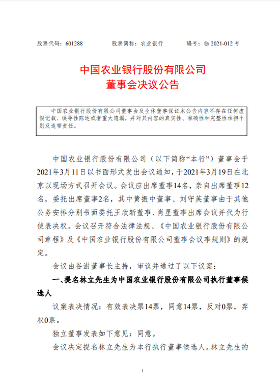 农业银行:提名刘晓鹏、肖翔为非执行董事候选人