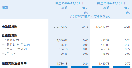 截至报告期末,贵州银行逾期贷款余额17.80亿元,较上年末增加3.6亿元,逾期率0.84%,较上年末上升0.05个百分点。其中,逾期3个月以上的贷款4.00亿元。