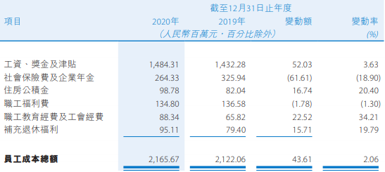 2020年,贵州银行员工成本总额为21.66亿元,同比增长2.06%。其中,工资、奖金及津贴14.84亿元,社会保险费及企业年金2.64亿元,住房公积金9878万元,职工福利费1.35亿元,职工教育经费及工会经费8834万元,补充退休福利9511万元。