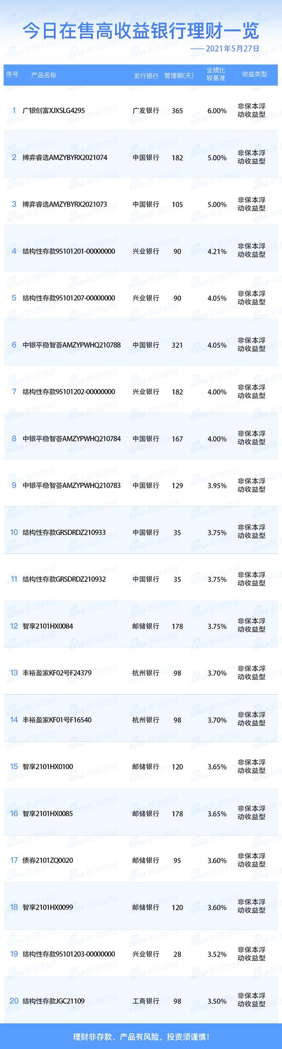 银行5月27日在售高收益理财产品