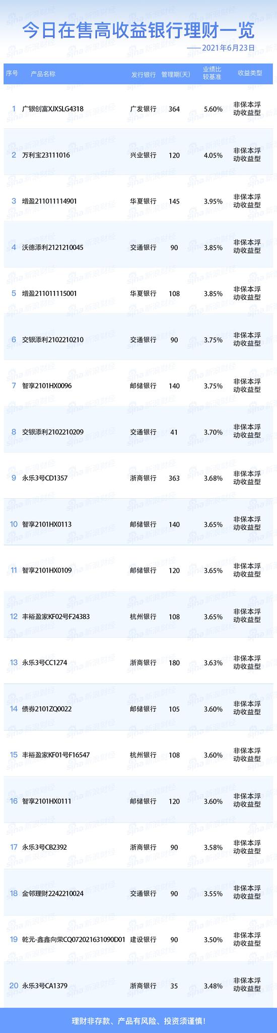•   新浪财经6月22日在售高收益银行理财产品:今日业绩比较基准在3.65%以上的银行人民币理财产品共10款。广发银行的“广银创富XJXSLG4318”业绩比较基准最高,为5.6%。