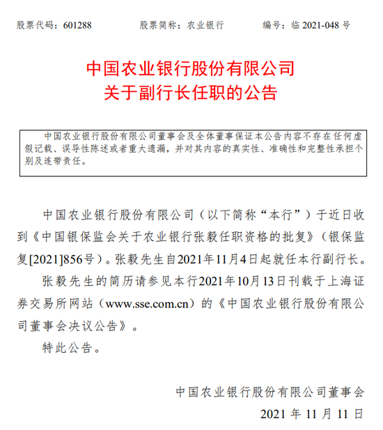 农业银行:刘晓鹏、肖翔就任非执行董事