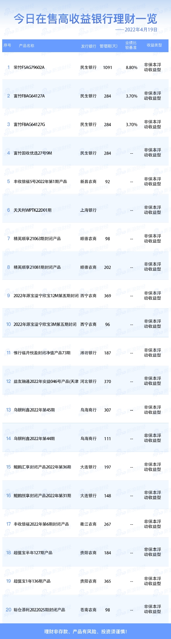 •   新浪财经4月19日在售高收益银行理财产品一览。今日业绩比较基准在3.70%及以上的银行人民币理财产品共3款。理财非存款、产品有风险、投资须谨慎!