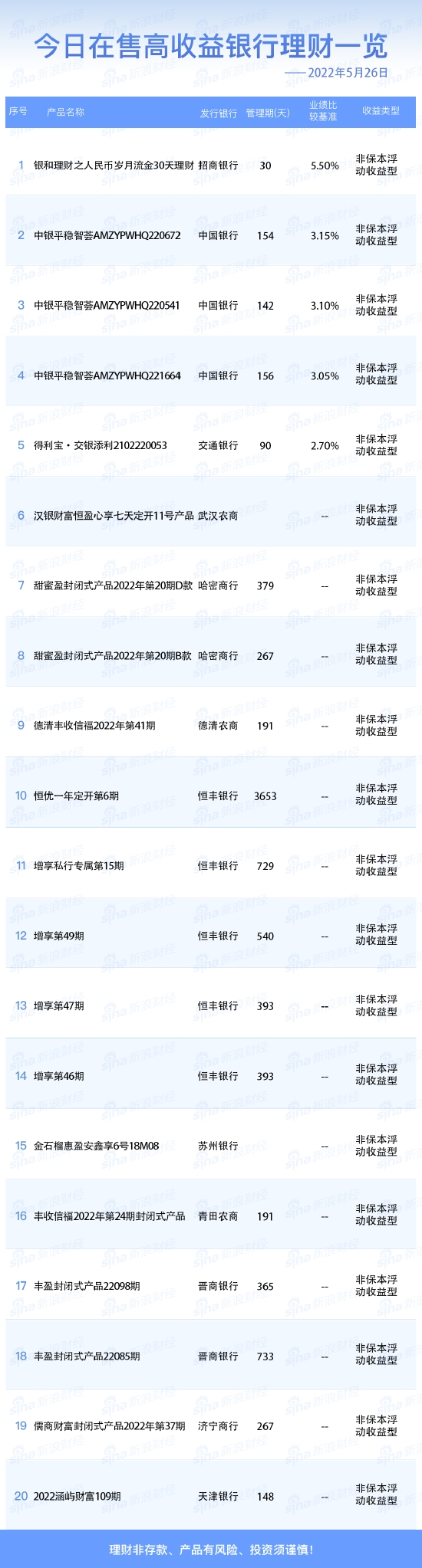 •   新浪财经5月26日在售高收益银行理财产品一览。今日业绩比较基准在2.70%及以上的银行人民币理财产品共5款。理财非存款、产品有风险、投资须谨慎!