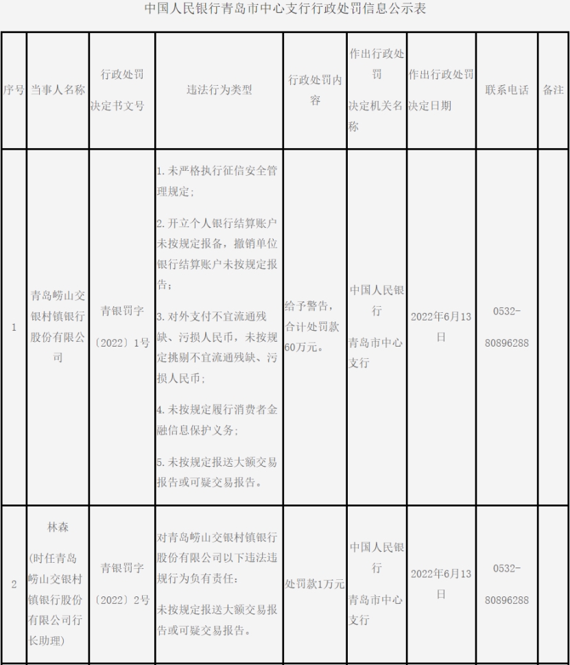 青岛平度惠民村镇银行违规被罚