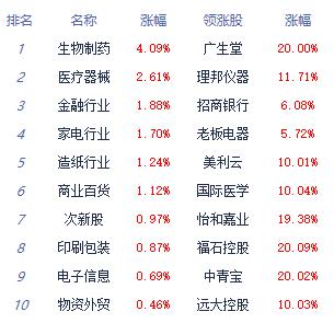 •   中国经济网北京11月14日讯 三大指数早盘走势分化,午后集体翻绿。板块方面,中药、医药商业、化学制药、房地产服务、医疗器械等涨幅居前,机场航运、贵金属、景点及旅游、金属新材料等跌幅居前。