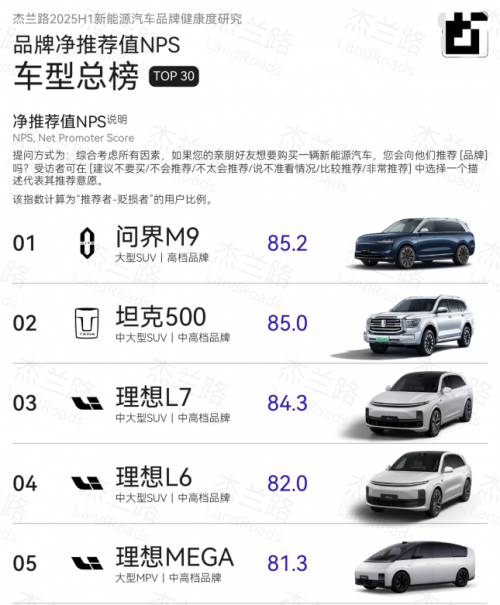 7月8日,杰兰路发布的《2025年度上半年新能源汽车品牌健康度研究(NPS篇)》,为行业提供了审视用户口碑与推荐意愿的关键视角。此次调研覆盖65个新能源汽车品牌、超过8200名新能源车主,结果显示,问界M9更以85.2的成绩,包揽车型NPS总榜与中大型及以上SUV榜单双料第一,在50万级以上高端市场树立了“口碑标杆”。