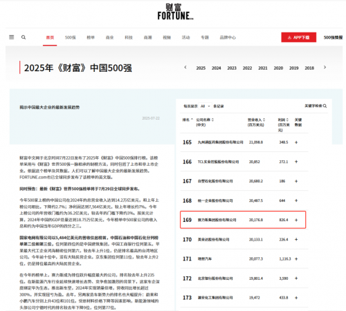 • 7月22日,2025年《财富》中国500强排行榜发布,赛力斯成为排名跃升幅度最大的公司,位居第169位,排名较去年上升235位。