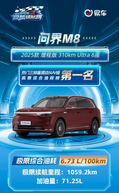 近日,易车网以直播的形式进行了2025新能源极限续航榜测试,考验众多主流新能源车型的续航能力。其中,问界M8以极限综合油耗6.73L/100km的成绩,在热门三排座混动SUV组极限综合油耗榜中夺得第一。