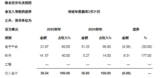• 截至2025年3月31日财年,营业收入为3,654万美元,与2024财年的3,660万美元的水平基本持平。软件类销售收入同比激增177%,达到1,457万美元,这得益于营销力度的加强,带来了客户数量显著增长。电子类产品销售收入下降30%,为2,197万美元,这一变化反映了公司向更高毛利类产品组合转型的战略布局。