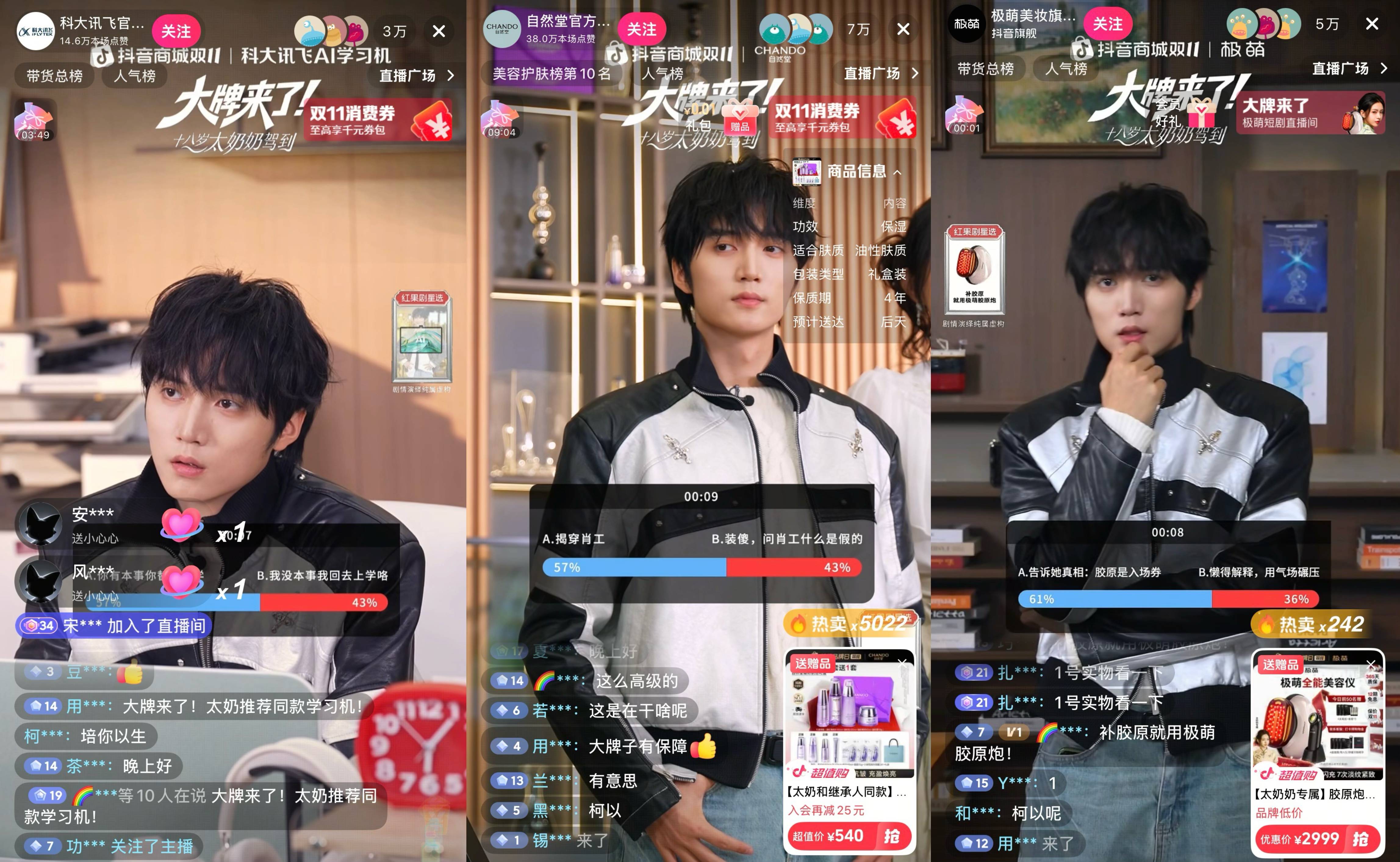 互动之后跳出的品牌优惠就像解锁故事彩蛋一样自然。科大讯飞AI学习机破解难题时,大家都在玩“纪总缺家教吗?”的梗;看到极萌胶原炮的即时效果,弹幕和评论区直接开始“求同款锋利下颌线”……品牌在故事中自然露出,解决痛点的同时完成种草,将更多用户分流引向各个品牌直播间。