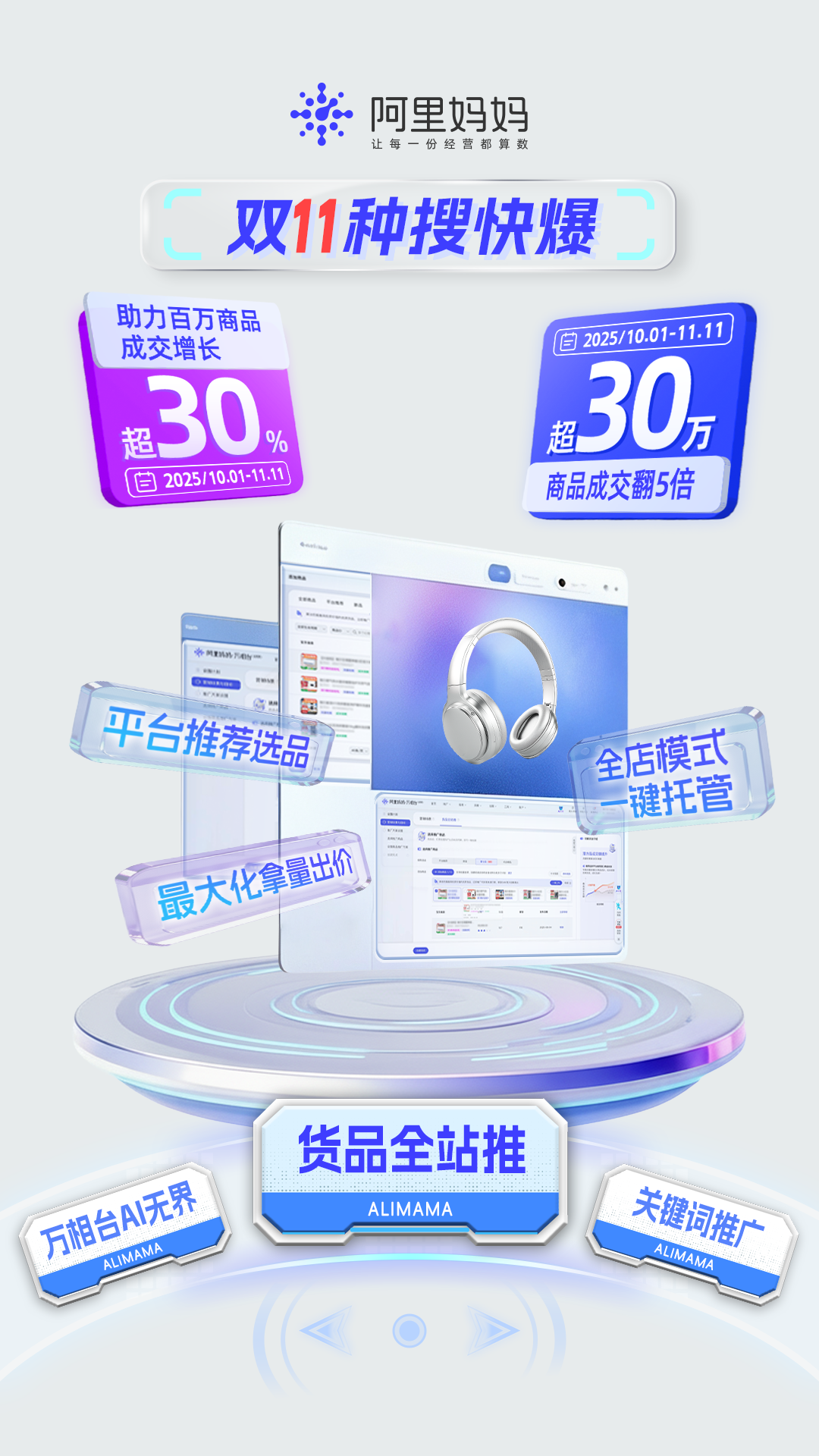 平台爆单的同时,商家也火热参与阿里妈妈双11系列提效活动。双11大促全周期阿里妈妈累计投入超30亿补贴,超30万商家火热报名「双11质赢」系列活动,其中,超10万商家积极完成目标,单商家至高获得200万,GMV同比增长超50%。