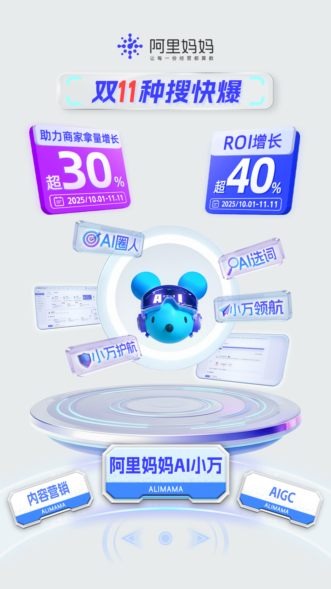 值得关注的是,备受商家好评的AI工具全方位助力大促经营提效。AIGC助力百万商家节省成本超35亿,阿里妈妈AI小万助力商家拿量增长超30%,ROI增长超40%。