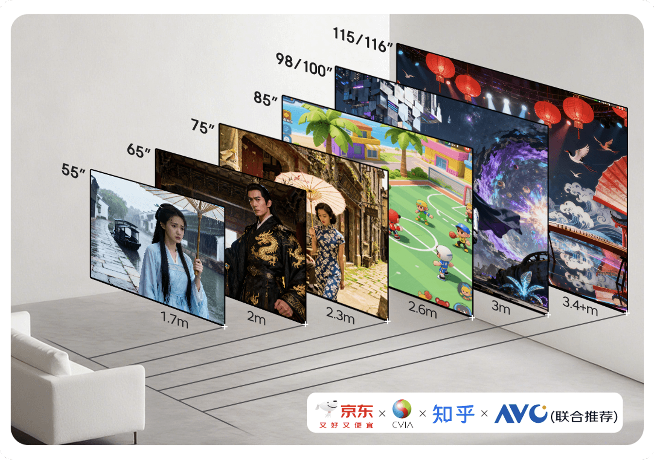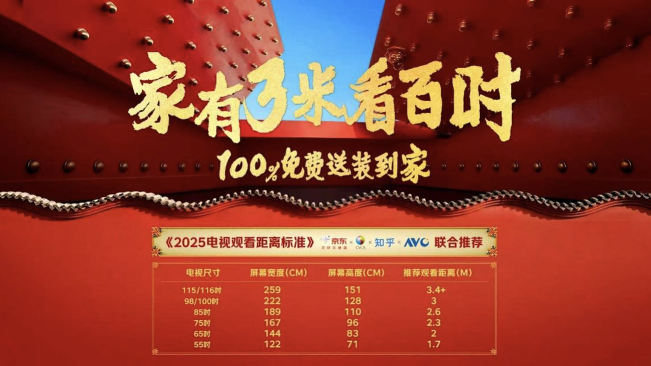 《2025电视观看距离标准》基于人眼视觉舒适度的深入研究,为百吋电视进入寻常客厅提供了科学依据,打破“客厅距离”这一长期制约百吋电视普及的核心消费障碍,使“家有3米看百吋”从“营销概念”转变为“可遵循的行业准则”。