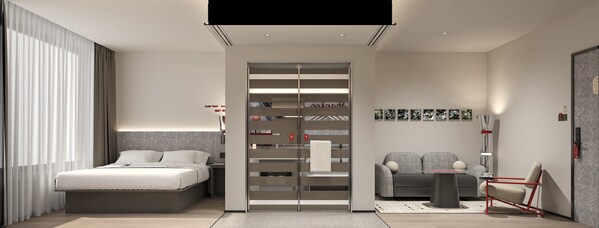 2. 灵活多变,超越期待:客厅的沙发床设计让空间功能随需而变。在25-30㎡的精巧空间内,通过更功能化的布局与更具设计感的氛围,传递出“优于标准间”的尊享感和性价比,实现以小的升级换取体验的跃迁。