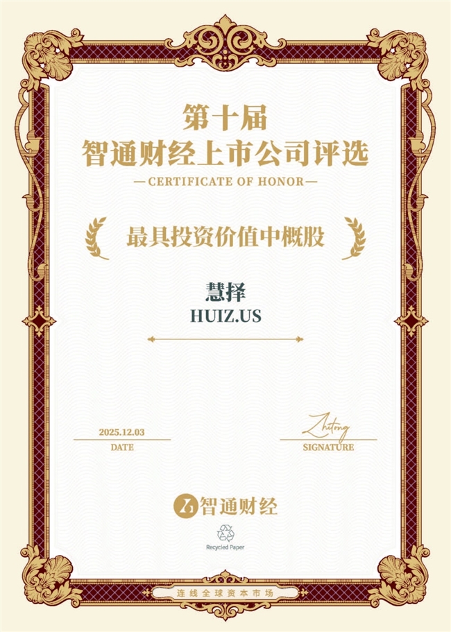 2025年12月3日,在由智通财经与新智基金网联合主办、冬日暖阳Donova独家承办的“第十届智通财经上市公司颁奖盛典”上,慧择(HUIZ.US)凭借其卓越的商业模式、优良的经营质效、持续的价值创造能力以及积极的社会责任实践,荣获“最具投资价值中概股”大奖。