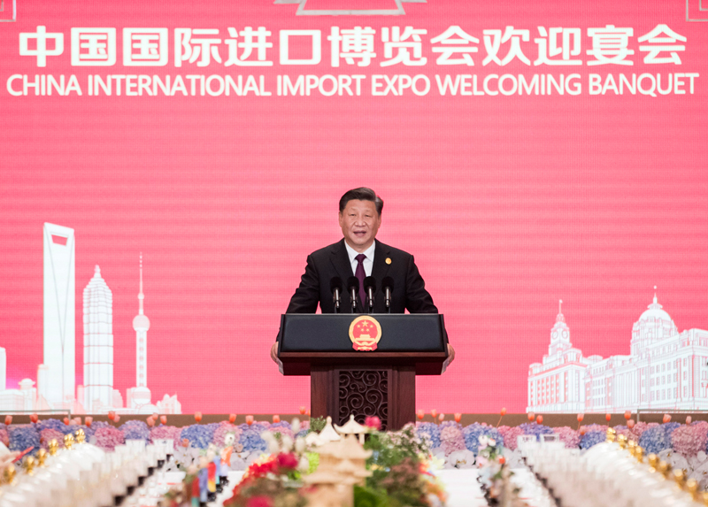 11月4日晚,国家主席习近平和夫人彭丽媛在上海和平饭店举行宴会,欢迎出席第二届中国国际进口博览会的各国贵宾。这是习近平发表致辞。新华社记者 王晔 摄