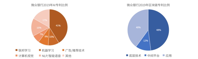在人工智能领域,微众银行正在从联邦学习、新一代人机交互、精准营销、智能资管发力,构建以人工智能驱动的金融业务生态,其专利主要覆盖方向包括联邦学习(41%)、NLP/智能语音(16%)、机器学习(10%)、广告/推荐技术(9%)、计算机视觉(7%)等等。而在区块链领域,微众银行有一套包括底层技术(48%)、中间件(12%)、方案应用(40%)的开源联盟链版图,其专利核心围绕底层平台及行业应用,覆盖算法、隐私保护、跨链技术等前沿方向。在近期国际区块链媒体The Block公布的2019全球区块链专利排行榜中,微众银行位列第三,同时也是前十名中唯一的银行。