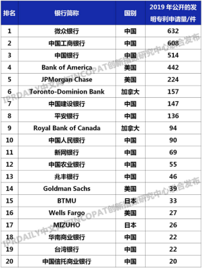 4月23日,具有全球影响力的知识产权媒体IPR Daily正式发布2019年全球银行发明专利排行榜(Top100)。在2018年榜单中排名第五的微众银行,今年以632件专利申请量成功跃居首位。