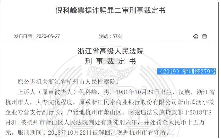 民泰银行原支行长骗42亿自分7亿 支行贷款却大量逾期
